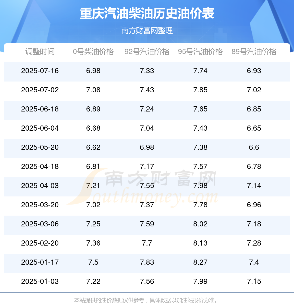 大宗商品交易跌了0.1元;95号汽油为7.74元7月20日,重庆汽油、柴油每升最新代价为:92号汽油为7.33元,跌了0.1元;95号汽油为7.74元,跌了0.11元;89号汽油为6.93元,跌了0.09元;0号柴油为6.98元,跌了0.1元,调理期间为7月16日。