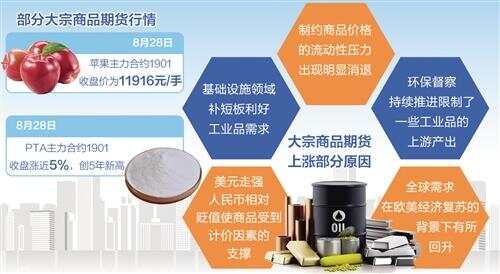 从全部商品指数看,近期冲破了保护一年的大轰动区间,创出近3年的新高,激励商场眷注的明星种类也越来越众。例如,上市亏损一年的苹果期货主力合约从本年4月份今后不停改善记录。8月28日,苹果主力合约1901收盘价为11916元/手;甲醇期货稳步上扬,创4年半新高;PTA(精对苯二甲酸)“暴走”行情连接,8月28日主力合约1901收盘涨近5%,创5年新高;连行情低迷许久的橡胶也终归“活”了过来,RU1901主力合约曾正在8月21日尾盘涨停。