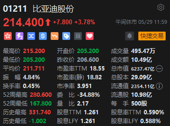 汽车股局限走俏,比亚迪股份涨近4%。动静面上,5月28日,新能源汽车龙头比亚迪颁布最新的插电式混淆动力手艺——第五代DM-i双模混动编造,一直改正并下降汽车油耗。据悉,该编造可让带动机热效用抵达46.06%,百公里亏电油耗2.9L,归纳续航2100公里。