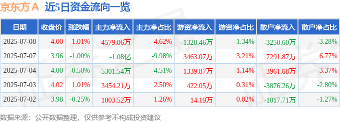 由AI算法生成(网信算备240019号)?百度股票证券之星新闻,截至2025年7月8日收盘,京东方A(000725)报收于4.0元,上涨1.01%,换手率0.68%,成交量249.21万手,成交额9.91亿元。