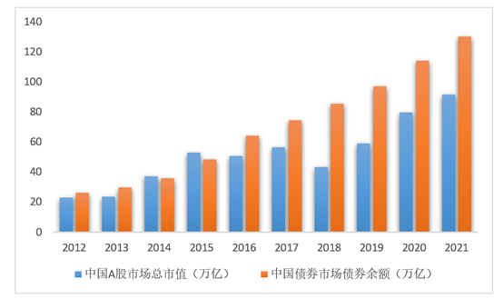 债券与股票的名头正在江湖中叱咤已久,信赖群众已知道不少。下图是中邦近十年来债券市集与股票市集的周围走势图,从中咱们能够创造,2015年后,中邦债券市集余额周围进步了股票市集市值周围。