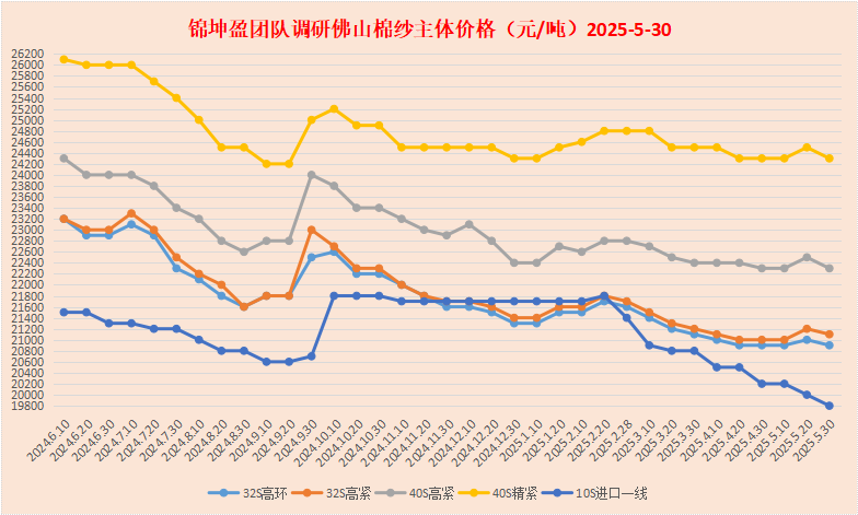 13、棉纱价值:棉花期现货上涨,纵使棉纱跟涨有限,市集并不接纳,5月下旬棉纱又回调至前期价值,价值仍正在阴跌。为了出货,纺纱厂及生意商有量可议。现时佛山市集现金含税主流报价,邦产牌子货纯棉32支高配环纺20800~20900元/吨,纯棉32支高配慎密20900~21100元/吨,纯棉40支高配慎密22100~22300元/吨,纯棉40支精梳慎密24100~24300元/吨,进口一线元/吨,整柜低贱100元/吨。