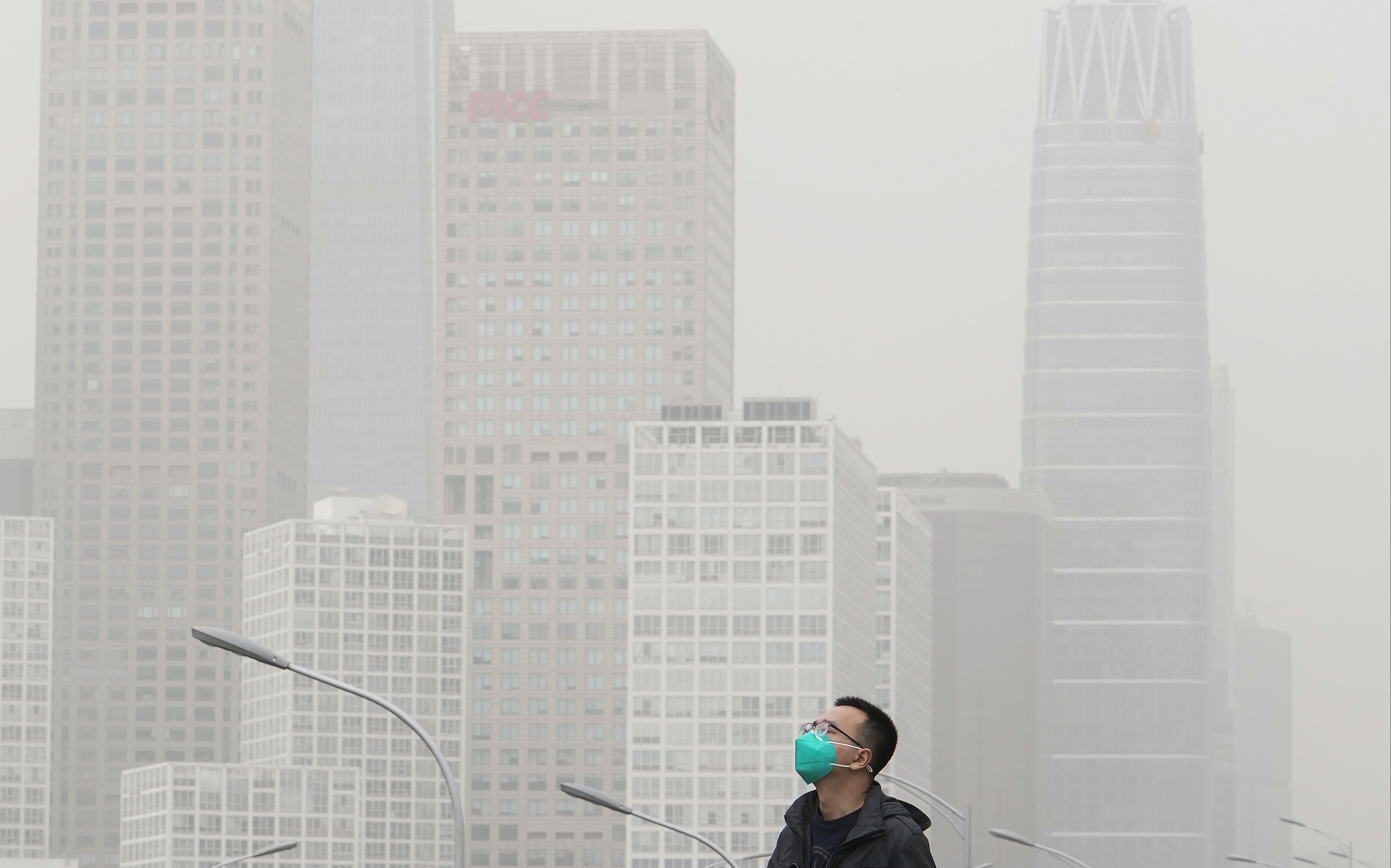 4月13日,沙尘暴袭击北京,一名戴着口罩的男人走正在焦点商务区左近的天桥上。图/视觉中邦
