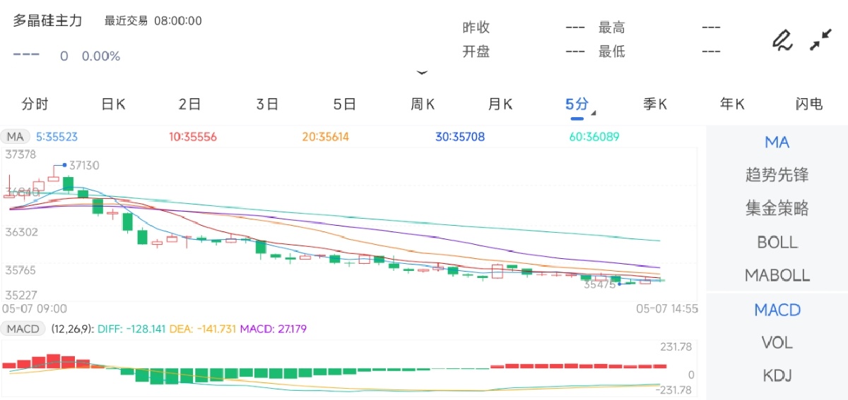 外汇行情软件pc版生产日期在90天以内(含当日)的多晶硅可申请注册标准仓单金投网APP行情中央数据显示,截止2025年5月7日下昼15:00收盘,众晶硅期货主力合约行情音信:最新价:35520,涨跌:-1150,涨跌幅:-3.14%,成交量:135166,开盘价:36670,昨收价:36410,最高价:37140,最低价:35470。