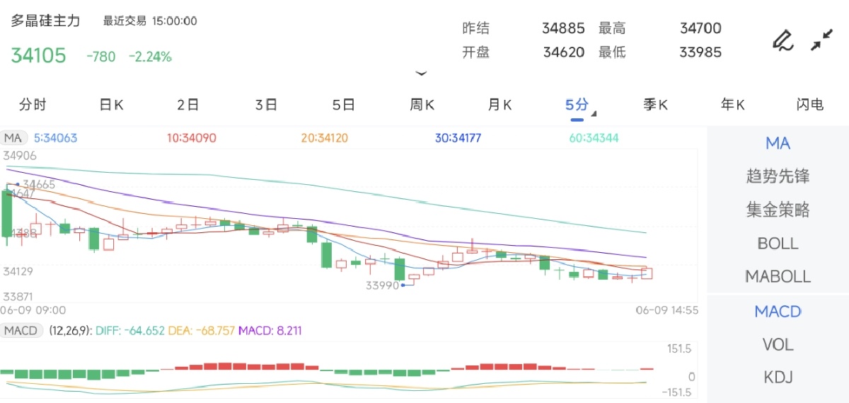 多晶硅期货主力合约开盘报34620.0元/吨2025年6月12日电脑版外盘期货软件金投网APP行情中央数据显示,截止2025年6月9日下昼15:00收盘,众晶硅期货主力合约行情消息:最新价:34105,涨跌:-780,涨跌幅:-2.24%,成交量:116877,开盘价:34620,昨收价:34740,最高价:34700,最低价:33985。