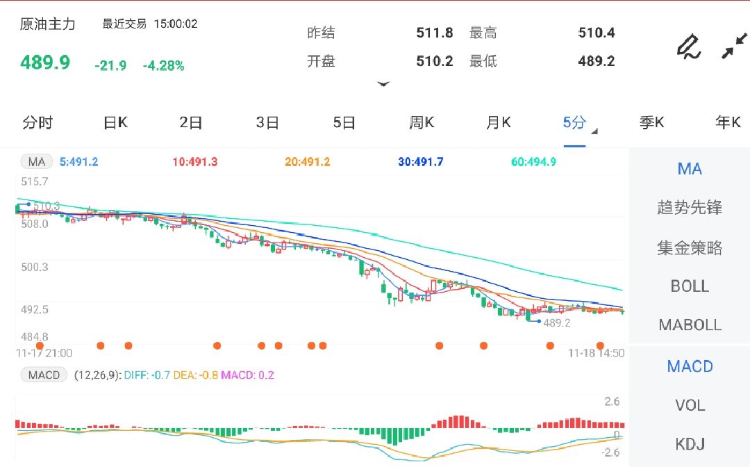 金投网APP行情核心数据显示,截止2021年11月18日下昼15:00收盘,原油期货主力合约行情音讯:最新价:489.9,涨跌:-21.9,涨跌幅:-4.28%,成交量:147728手,开盘价:510.2,昨收价:510.4,最高价:510.4,最低价:489.2。