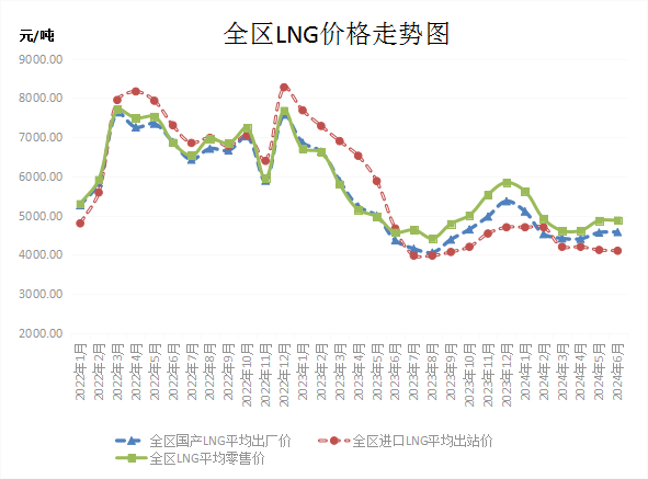 6月份,全区邦产LNG均匀出厂代价、进口LNG均匀出站代价、LNG均匀零售代价分歧为每吨4578.50元、4100.00元、4878.54元。环比,邦产LNG均匀出厂代价、LNG均匀零售代价分歧略涨0.32%、0.19%,进口LNG均匀出站代价低重0.49%;同比,邦产LNG均匀出厂代价、LNG均匀零售代价分歧上涨4.86%、6.77%,进口LNG均匀出站代价低重12.18%。