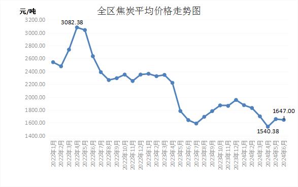 6月份,全区焦炭月度均匀代价为1647.00元/吨,环比代价略降0.71%,同比代价略涨0.24%。