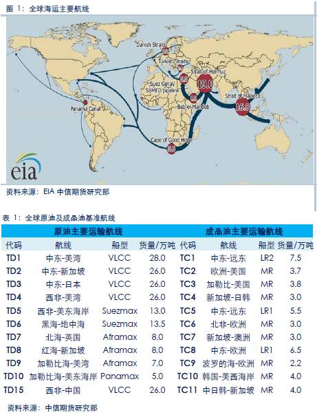 1)最大海运流量来自波斯湾的中东原油,经由霍尔木兹海峡出至阿拉伯海,向东去往印度或过马六甲海峡运往中日韩;向西经由曼德海峡过苏伊士运河,或绕好望角运往欧洲或美湾/美东海岸。