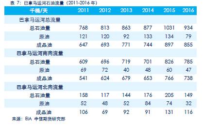 巴拿马运河并非环球石油运输最苛重航道,2015年石油运量仅占环球总运量的1.7%。2016年石油运量为92万桶/日,个中84万桶为制品油,其余为原油。汽油运量(77.5万桶/日)的84%均为由大西洋至平和洋的南向运输。