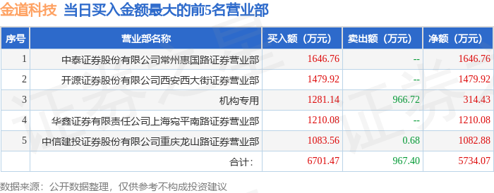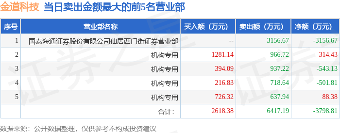 深股通专用、沪股通专用为北向资金的交易席位!炒股知识干货证券之星音讯,沪深业务所2025年12月10日通告的业务公然音讯显示,金道科技(301279)因日涨幅到达15%的前5只证券登上龙虎榜。此次是近5个业务日内第1次上榜。