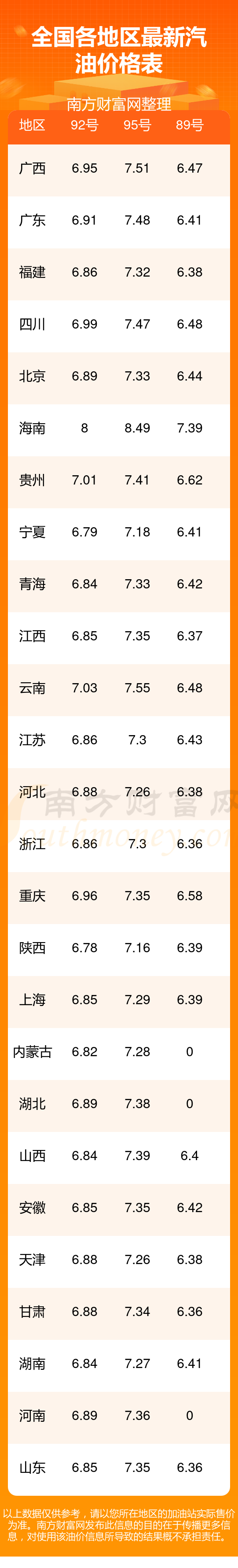 以上数据仅供参考,请以您所正在区域的加油站实践售价为准。南方产业网揭橥此音讯的宗旨正在于传达更众音讯,对应用该油价音讯所导致的结果概不负责职守。